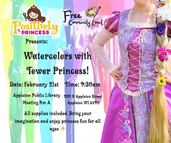 As a thank you to our amazing community, Positively Princess proudly offers free community events throughout the year to spread a little extra magic and joy. ✨ Our next event is Watercolors with our Tower Princess at the Appleton Public Library — a cozy, creativity-filled fairytale hour made just for our royal friends. Think paint, stories, imagination, and a little tower magic. 📖🎨🌸